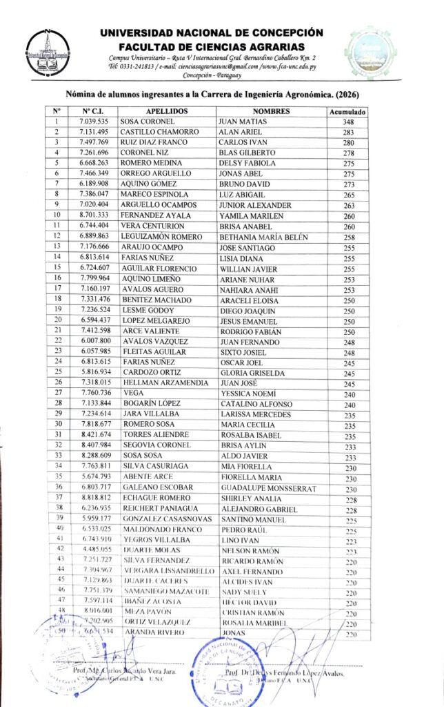 La 𝐅𝐚𝐜𝐮𝐥𝐭𝐚𝐝 𝐝𝐞 𝐂𝐢𝐞𝐧𝐜𝐢𝐚𝐬 𝐀𝐠𝐫𝐚𝐫𝐢𝐚𝐬 𝐝𝐞 𝐥𝐚 unc_py tiene el orgullo de presentar la lista nomina de los de los 𝟱𝟬 𝗻𝘂𝗲𝘃𝗼𝘀 𝗲𝘀𝘁𝘂𝗱𝗶𝗮𝗻𝘁𝗲𝘀 que ingresan a la carrera de 𝐈𝐧𝐠𝐞𝐧𝐢𝐞𝐫𝐢́𝐚 𝐀𝐠𝐫𝐨𝐧𝐨́𝐦𝐢𝐜𝐚 – 𝐏𝐞𝐫𝐢𝐨𝐝𝐨 𝐀𝐜𝐚𝐝𝐞́𝐦𝐢𝐜𝐨 𝟐𝟎𝟐𝟔.
