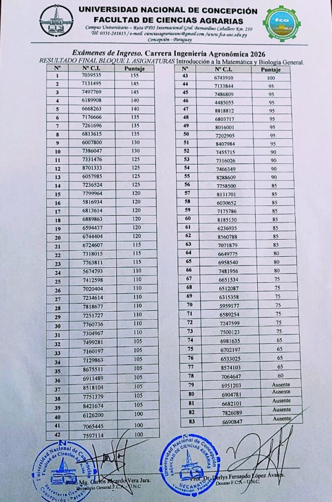 La Facultad de Ciencias Agrarias de la Universidad Nacional de Concepción cumple con informar los resultados finales del Examen de Ingres o de la carrera de Ingeniería Agronómica , correspondiente al Bloque I (Introducción a la Matemática y Biología General).